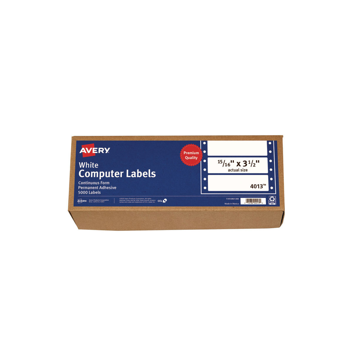 Print large quantities of labels on continuous label sheets with Avery labels for pin-fed and dot matrix printers. Each sheet is perforated so that you can easily separate the labels. Each label uses permanent adhesive that sticks and stays securely without having the corners lift and curl. The permanent adhesive works great on paper, cardboard, glass, and metal and are ideal as mailing and shipping labels. Perfect for big projects and large quantities, continuous-feed labels let you print thousands of labels without having to constantly reload sheets into a standard desktop printer. Easily print address labels, shipping labels, product labels, file folder labels, barcode labels and more.