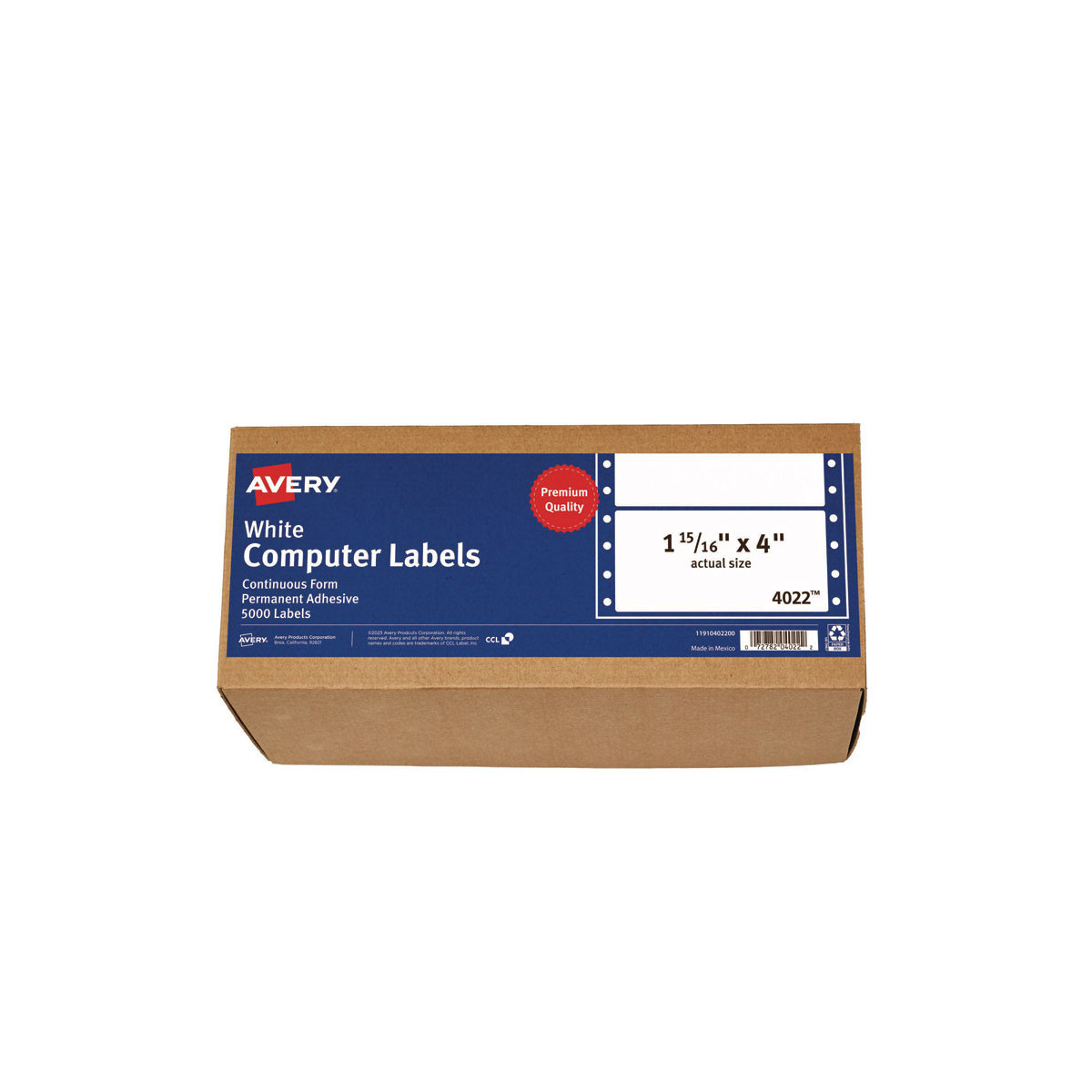 Print large quantities of labels on continuous label sheets with Avery labels for pin-fed and dot matrix printers. Each sheet is perforated so that you can easily separate the labels. Each label uses permanent adhesive that sticks and stays securely without having the corners lift and curl. The permanent adhesive works great on paper, cardboard, glass, and metal and are ideal as mailing and shipping labels. Perfect for big projects and large quantities, continuous-feed labels let you print thousands of labels without having to constantly reload sheets into a standard desktop printer. Easily print address labels, shipping labels, product labels, file folder labels, barcode labels and more.