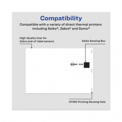 Durable thermal labels are smudge-free and resist scratches, water, dirt, dust and grease. Compatible with select DYMO®, Seiko® and Zebra® label printers. Strong, permanent adhesive sticks and stays. Packed in a secure bag to protect from light and ensure optimal performance. Permanent adhesive. Roll format with a 1" core.