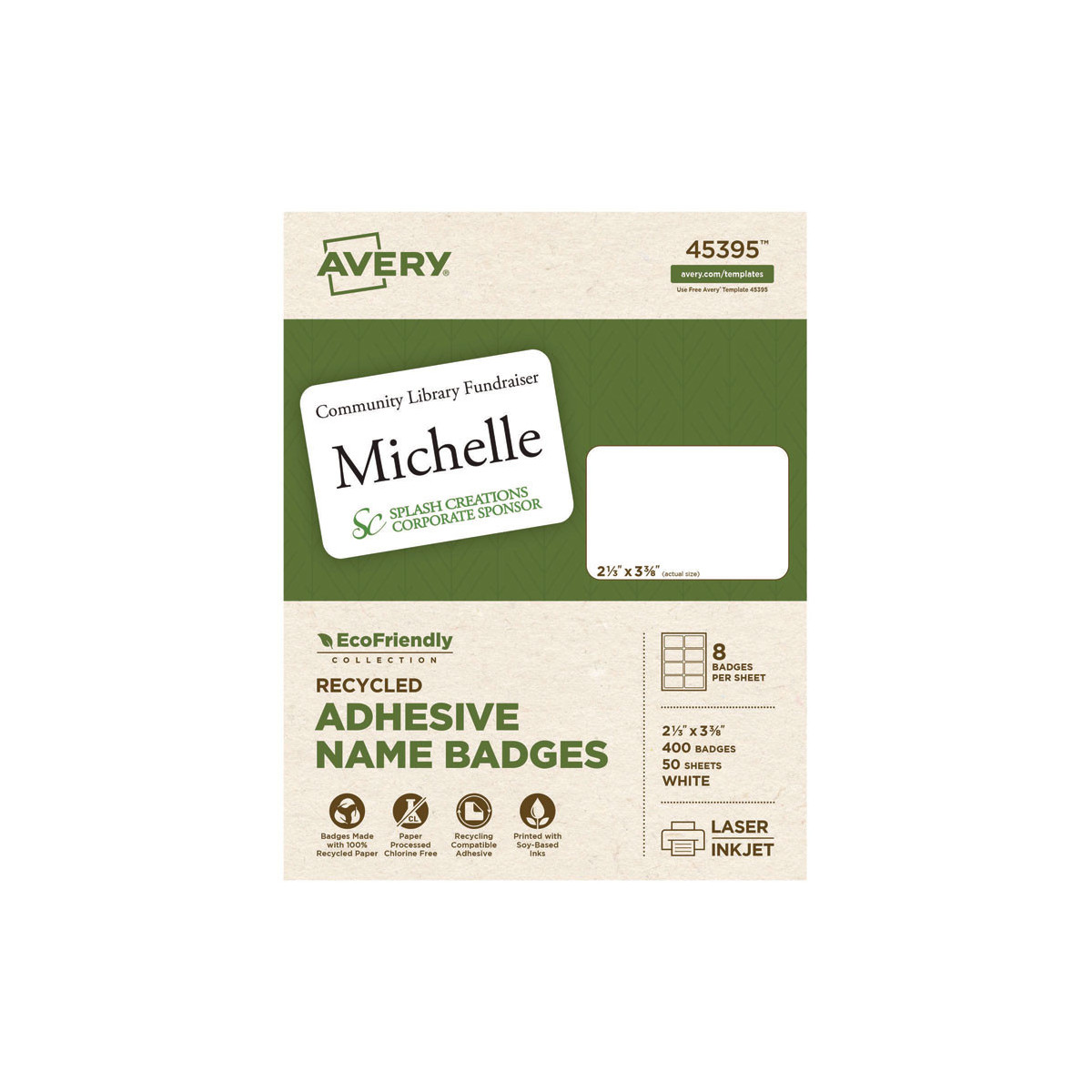 When you're meeting new faces for the first time, be smart with EcoFriendly Adhesive Name Badges—the labels that work for you. The label paper and packaging are made entirely of recycled materials. Both the product and its packaging are also processed chlorine-free to substantially reduce the harmful substances associated with the manufacturing process. After use, you can maintain your good habits, as both the label paper and packaging are completely recyclable. All pre-printed components of the product employ soy- and vegetable-based inks, which come from renewable materials. With Avery® EcoFriendly Name Badges, you can trust in the same high quality you've come to rely on from all Avery® products; and with free templates from Avery® Design & Print, you can create and customize your name tags in a snap. 8 1/2" x 11" sheets for laser and inkjet printers.