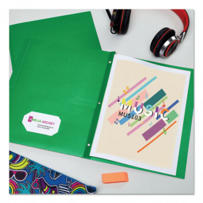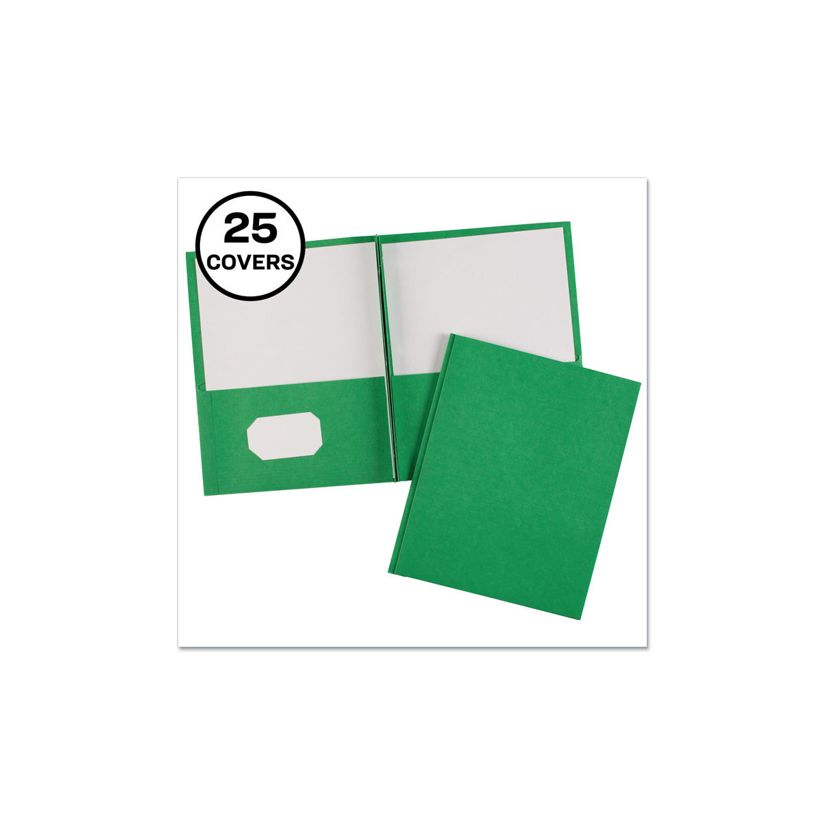 Textured paper folders are great for proposals or general office use. Two pockets-each holds up to 10 sheets of loose paper; sturdy metal three-prong fasteners secure up to 50 sheets of punched paper (folder holds up to 70 sheets, total). Features business card slots on the inside front pocket.