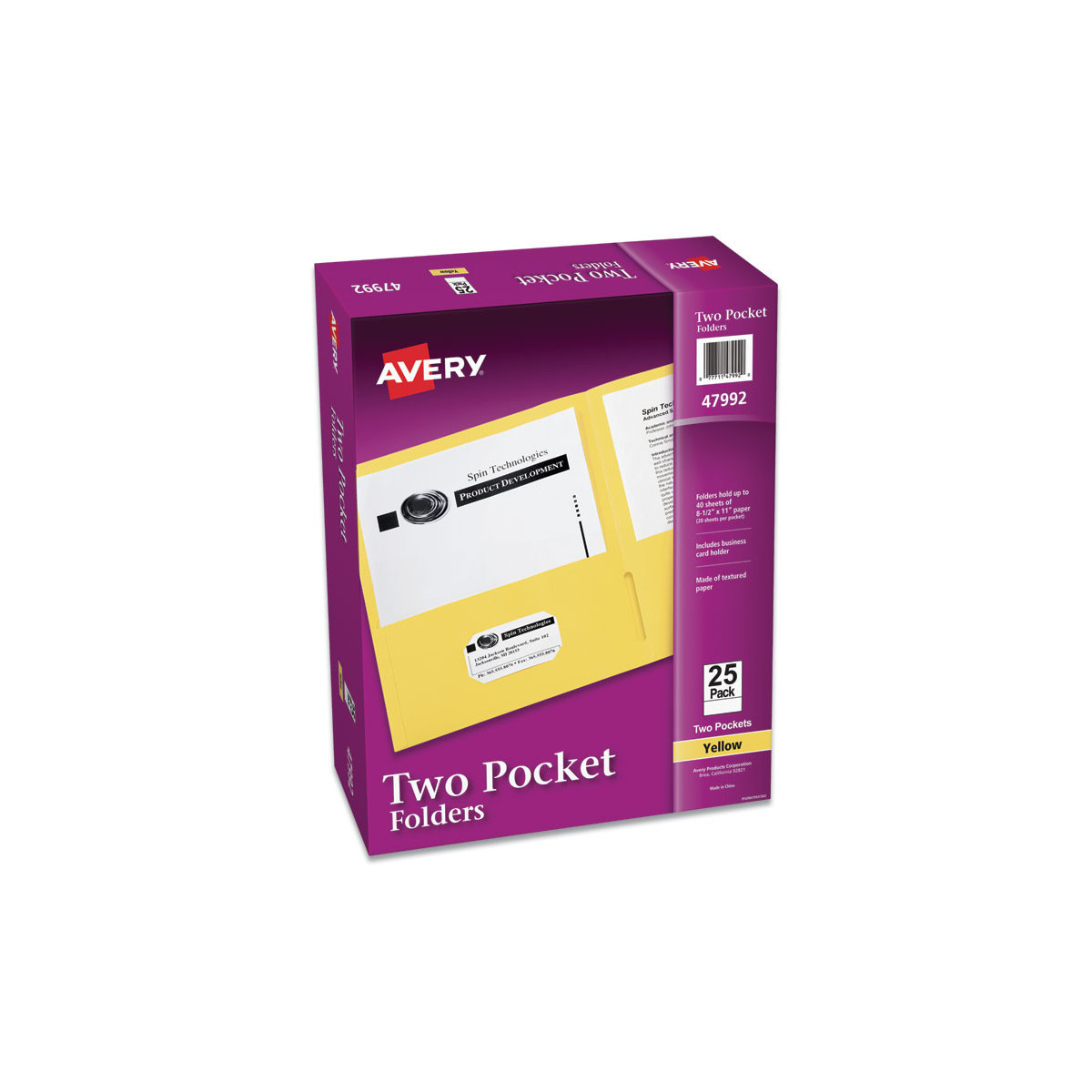 Keep your documents organized with Avery Two Pocket Folders. The textured paper 8" x 11.5" document folder features two internal pockets designed to hold a variety documents. Use the folders to create school folders for the upcoming next semester, presentation folders for a trade show, office folders to hold important project documents, and more. Load and unload documents at ease as each pocket corner includes built-in open side notches designed for easier access to your pages. These paper folders also allow you to write on or add a label to its cover. Holds up to 40 sheets of paper (20 per pocket).