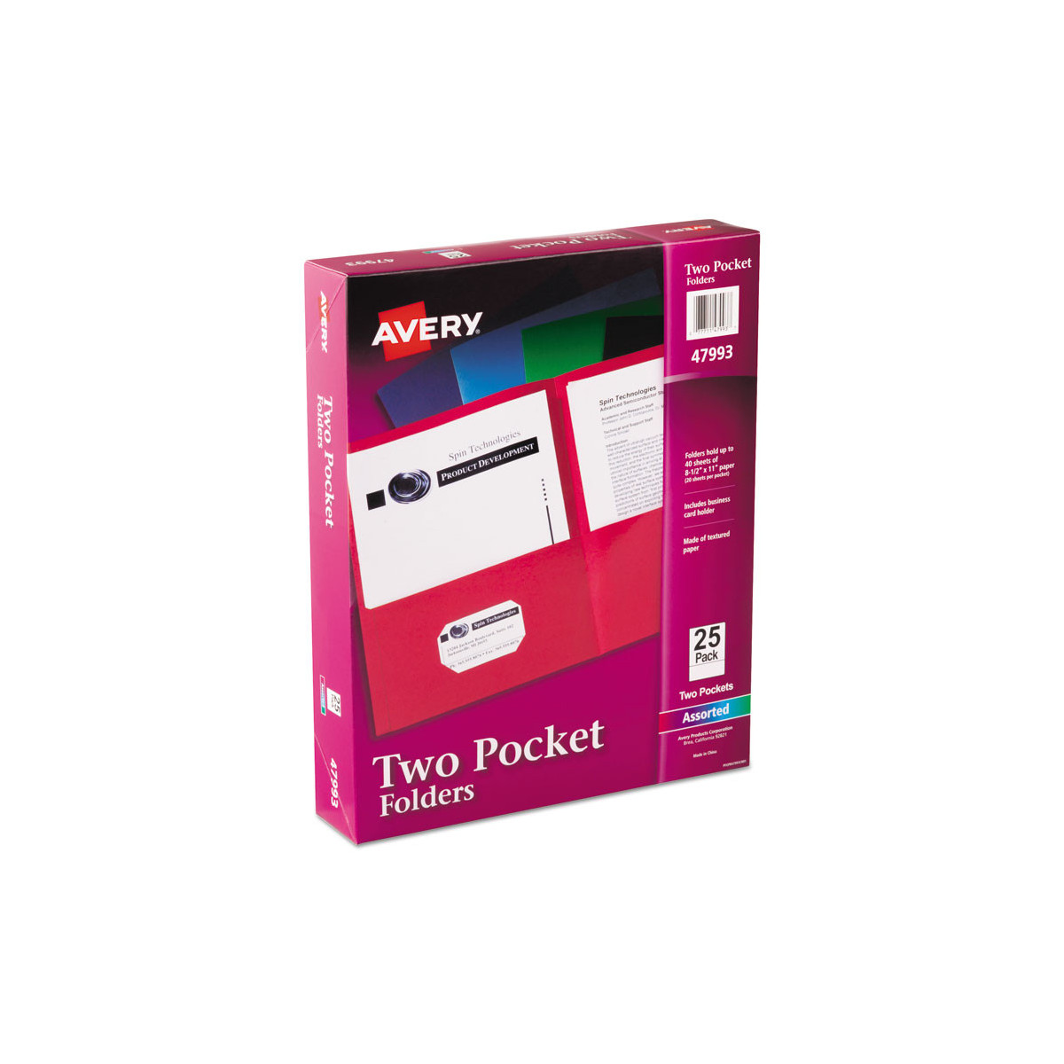 Keep your documents organized with Avery Two Pocket Folders. The textured paper 8" x 11.5" document folder features two internal pockets designed to hold a variety documents. Use the folders to create school folders for the upcoming next semester, presentation folders for a trade show, office folders to hold important project documents, and more. Load and unload documents at ease as each pocket corner includes built-in open side notches designed for easier access to your pages. These paper folders also allow you to write on or add a label to its cover. Holds up to 40 sheets of paper (20 per pocket).