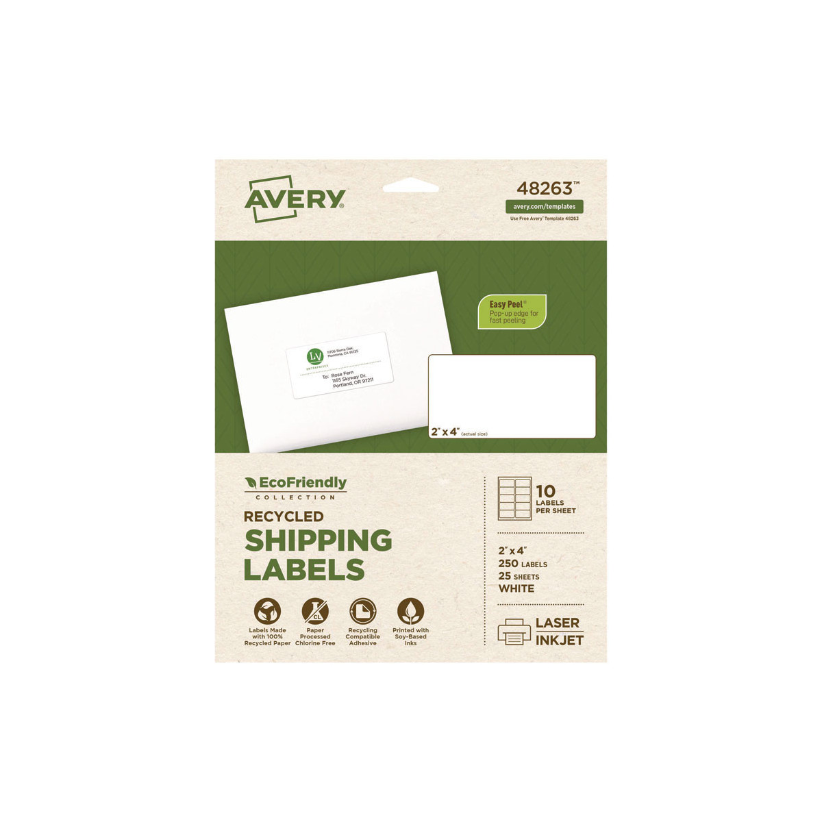 A natural choice for doing right by the environment. EcoFriendly mailing labels are made of 100% recycled material, processed Chlorine Free and printed using soy based ink. Easy to customize with free templates from Avery® Design & Print. 8.5 x 11 sheets for laser and inkjet printers.