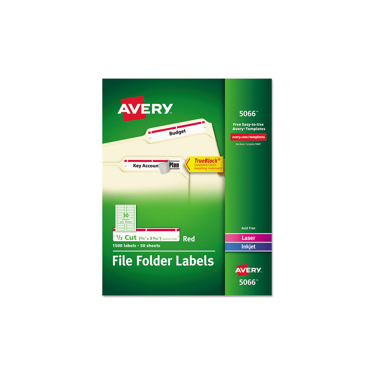 TrueBlock® Technology completely covers up what's underneath so you can create new folders or cover up handwriting or an existing label. Reuse file folders and still obtain a professional appearance. Labels with Sure Feed® technology are designed for a reliable feed through your printer. Easy to customize with free templates from Avery® Design & Print. 8 1/2" x 11" sheets for laser and inkjet printers.
