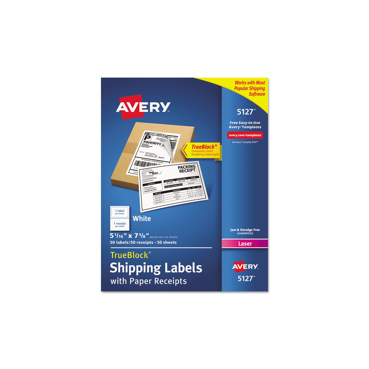 Shipping made fast and easy. Ultrahold™ Adhesive sticks to more tough surfaces, ensuring that your label doesn't fall off your package. For use with popular internet shipping software and services such as UPS®, FedEx® and both USPS® Click-N-Ship® and Shipping Assistant®. Efficient design combines the shipping label and paper receipt onto one sheet. Powerful TrueBlock® Technology: guaranteed to completely cover up everything underneath so you can reuse boxes, large envelopes and mailing tubes. Easy to customize with free templates from Avery® Design & Print. 8 1/2" x 11" sheets for laser and inkjet printers.
