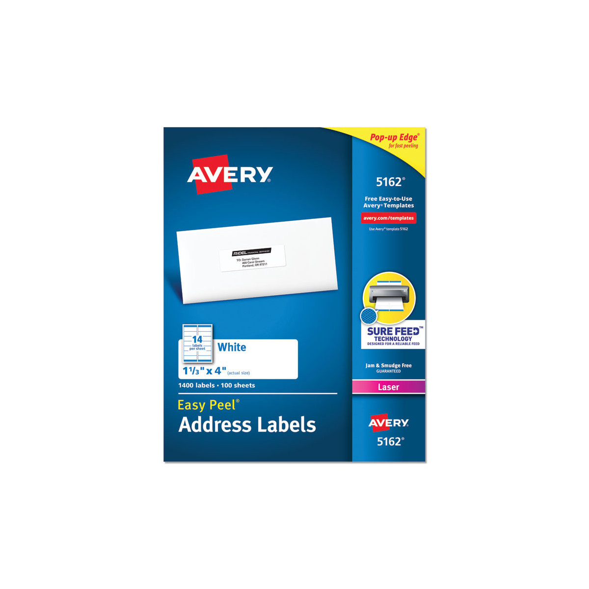 Easy Peel White Address Labels w/ Sure Feed Technology, Laser Printers, 1.33 x 4, White, 14/Sheet, 100 Sheets/Box
