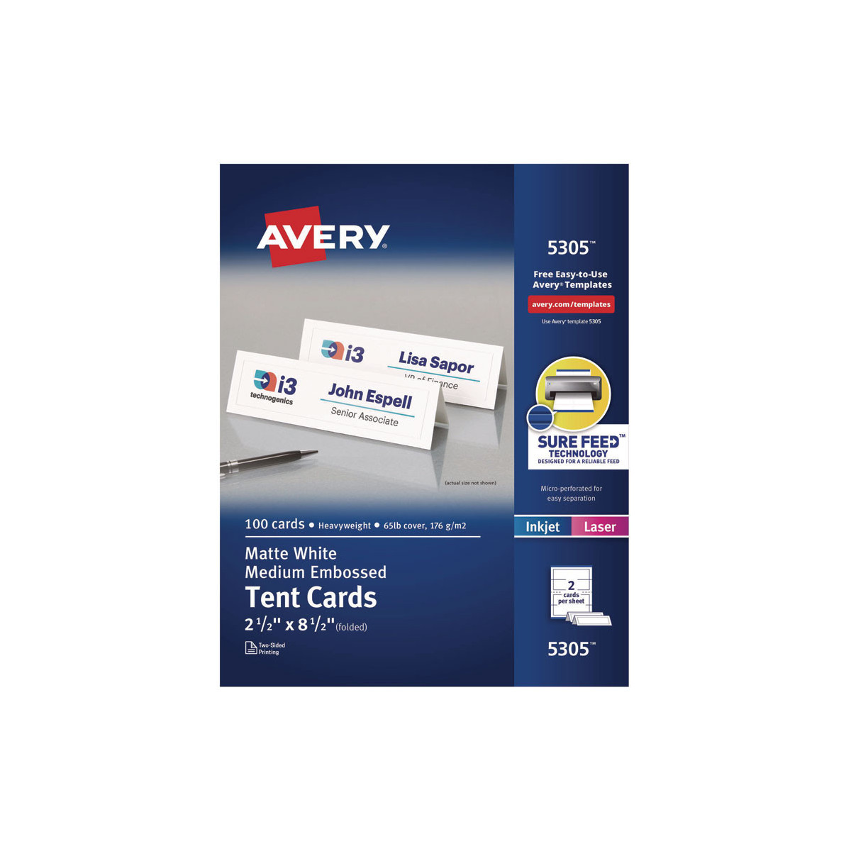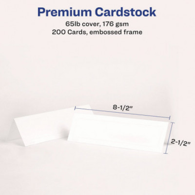 Fold-over rectangular cards sit atop any flat surface for great visibility. Card stock is ideal for name cards in meetings, presentations, seminars and classrooms. Use as place cards for marking "reserved" seating at tables, weddings, catered events or for displaying any type of communication prominently. Ultra-fine perforations let you separate cards cleanly and easily for a professional appearance and are pre-scored for easy folding. Easy to customize with free designs and templates from Avery Design & Print. 8.5" x 11" sheets for laser and inkjet printers.