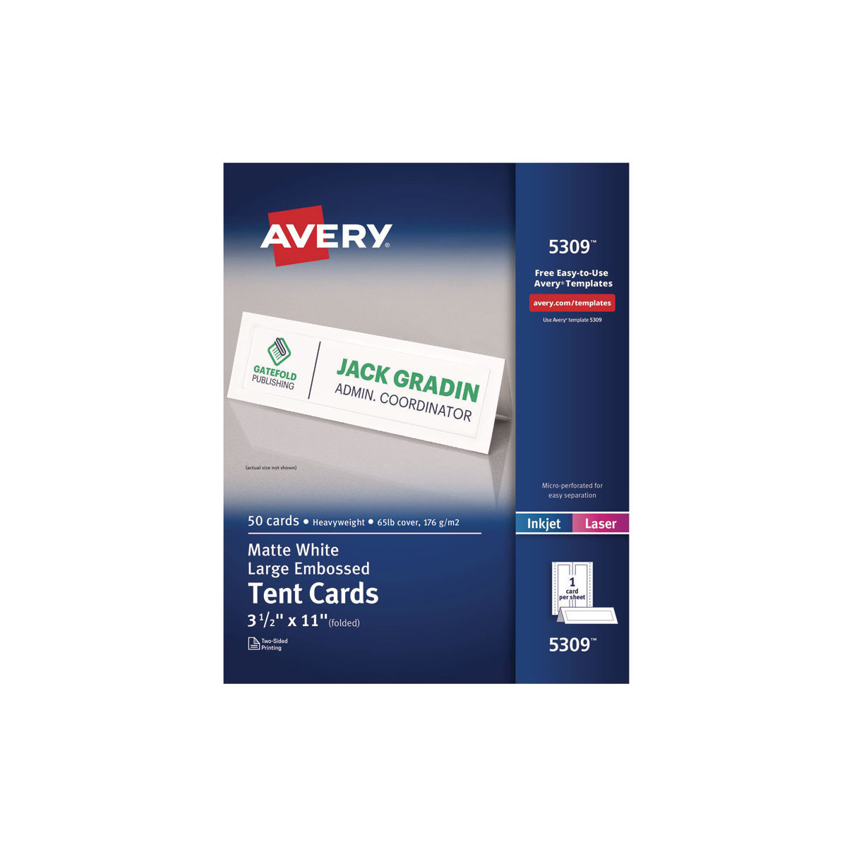 Fold-over rectangular cards sit atop any flat surface for great visibility. Card stock is ideal for name cards in meetings, presentations, seminars and classrooms. Use as place cards for marking "reserved" seating at tables, weddings, catered events or for displaying any type of communication prominently. Ultra-fine perforations let you separate cards cleanly and easily for a professional appearance and are pre-scored for easy folding. Easy to customize with free designs and templates from Avery Design & Print. 8.5" x 11" sheets for laser and inkjet printers.