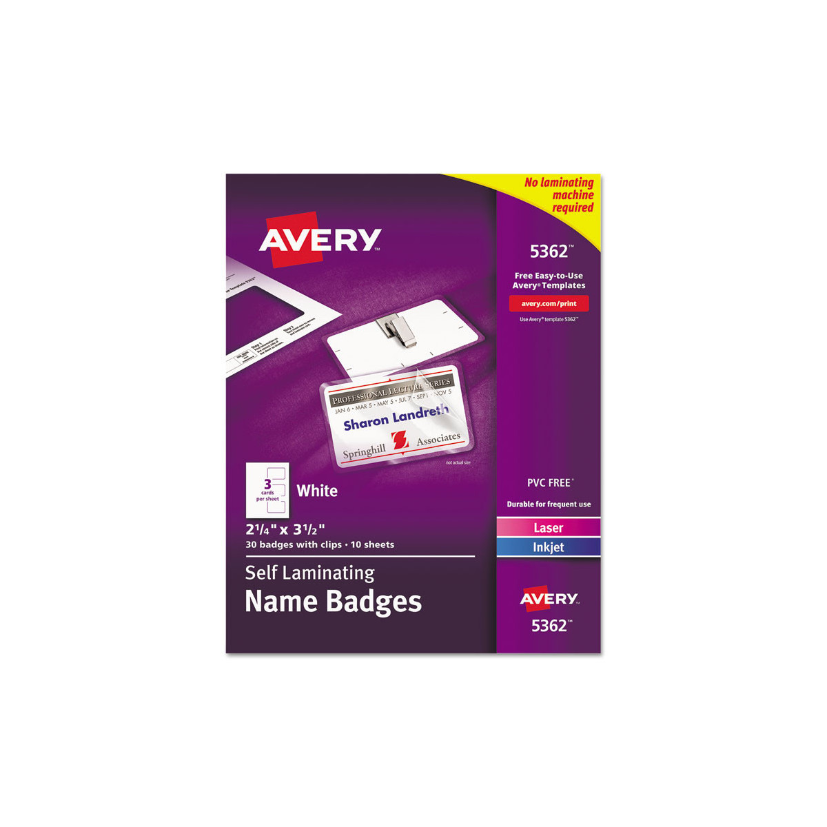 Create durable, laminated name badges. Print, punch out card and fold over lamination. Premium cardstock with ultra-fine perforations. Garment-friendly clip included. Easy to customize with free templates from Avery® Design & Print. 8.5" x 11" sheets for laser and inkjet printers.