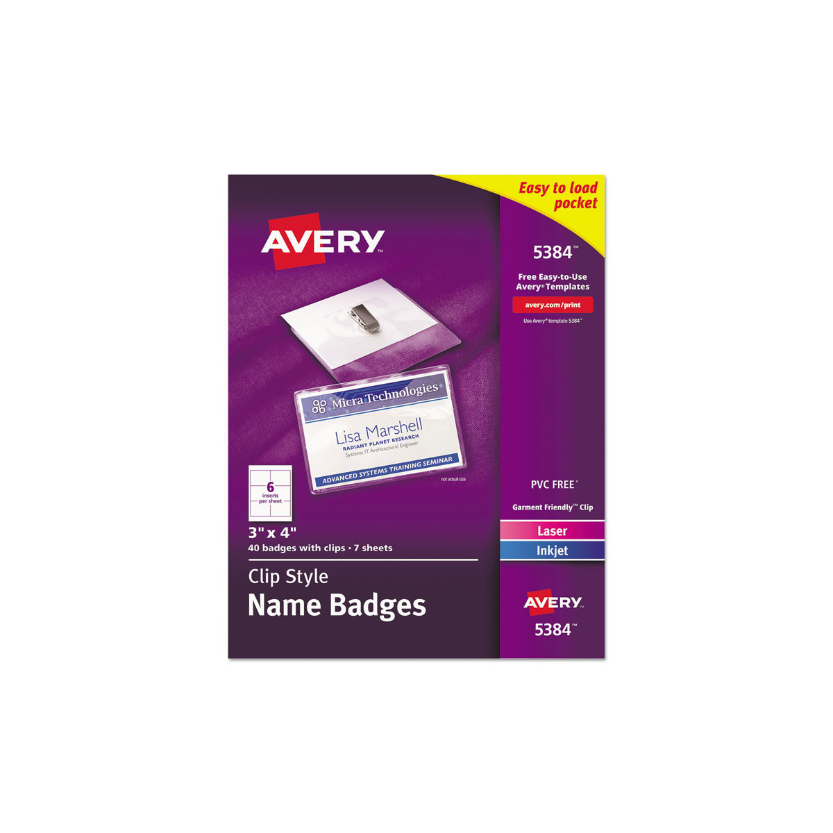 These badges feature a durable, easy-to-load, open top, pocket-style design. White micro-perforated name badge inserts are printable on both sides and separate cleanly leaving smooth edges. Create badges with text and colorful graphics using free designs and templates with Avery® Design & Print. Plastic holder is reusable and displays names clearly. 8.5 x 11 sheets for laser and inkjet printers.