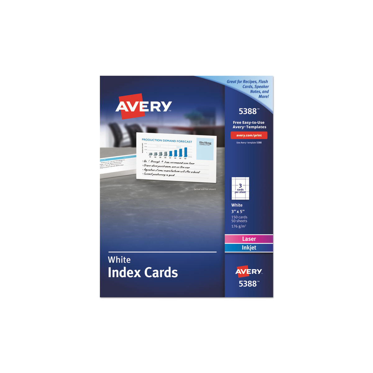 Bright white cardstock is ideal for recipes, homework, filing, and more. Custom printed index cards are consistent, easy to read, and easy to update. Ultra-fine perforations let you separate cards cleanly and easily. Easy to customize with free designs and templates from Avery Design & Print. Cards with Sure Feed® technology are designed for a reliable printer feed and to prevent jams and mis-alignments. 8.5" x 11" sheets for laser and inkjet printers.
