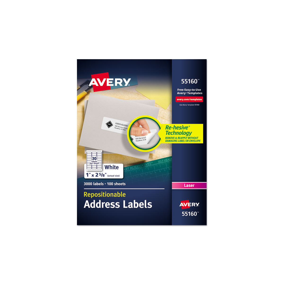 When you want your labels placed just right, count on these repositionable addressing and shipping labels to help you get the job done. It's easy to correct labels placed improperly, upside down or even with the wrong address. With Avery® Re-hesive™ technology, you can remove and reapply without damaging the label or envelope. But over time, the adhesive becomes permanent and is guaranteed not to fall off. Easy to customize with free templates and designs from Avery® Design & Print. It's that easy.