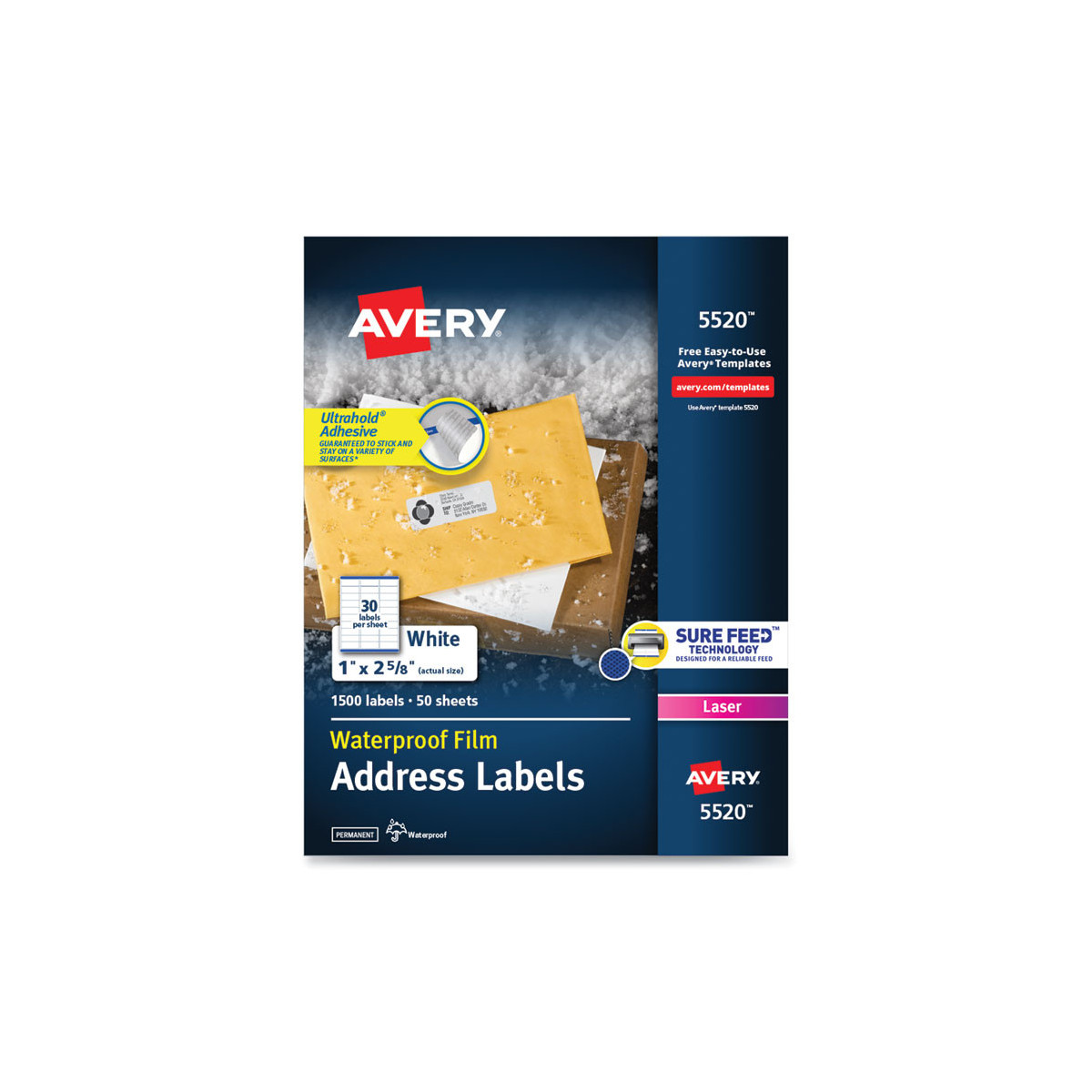 Don't let a little rain or snow worry you when you need to send a package. Waterproof labels stand up to the toughest environmental conditions and extreme temperatures, while resisting scuffs, tears and smudges, so they remain easy to read. Ultrahold® Adhesive sticks to more tough surfaces: metal, plastic, glass and more, ensuring your label doesn't fall off your package. They also resist. TrueBlock® Technology completely covers everything underneath your label, so you can reuse boxes, mailing tubes and more. With free printable templates and designs from Avery® Design & Print, you can create custom labels with sharp text and graphics in minutes. Waterproof and UV-resistant. 8.5" x 11" sheets for laser printers.