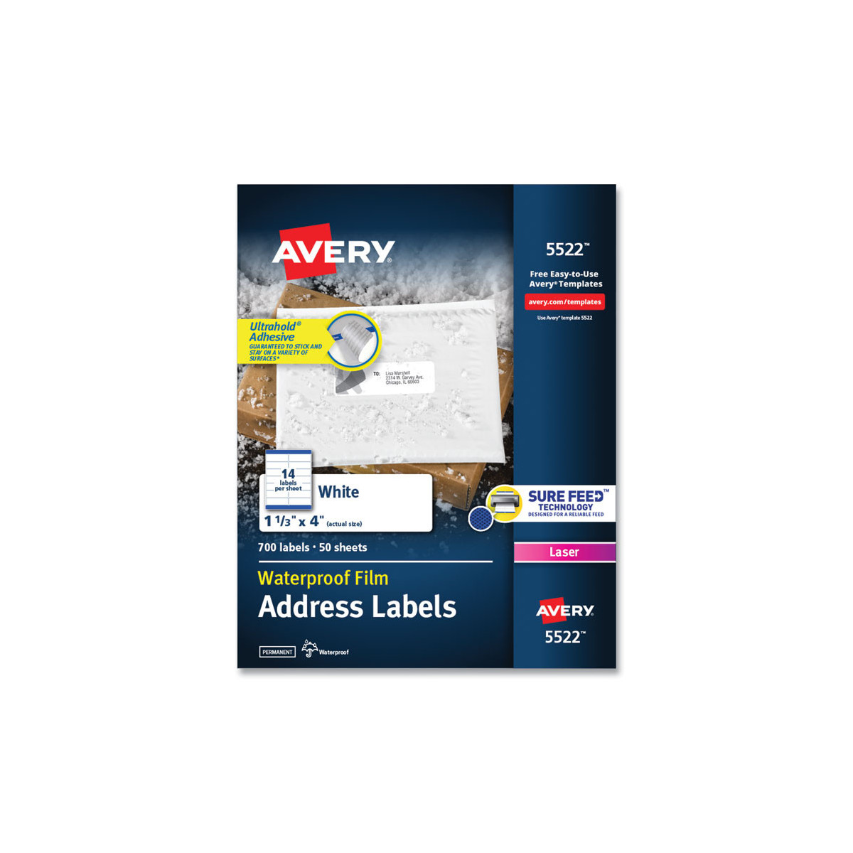Waterproof Address Labels with TrueBlock and Sure Feed, Laser Printers, 1.33 x 4, White, 14/Sheet, 50 Sheets/Pack
