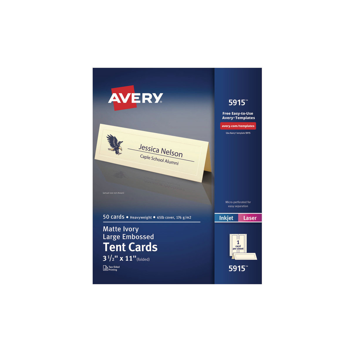 Fold-over rectangular cards sit atop any flat surface for great visibility. Card stock is ideal for name cards in meetings, presentations, seminars and classrooms. Use as place cards for marking "reserved" seating at tables, weddings, catered events or for displaying any type of communication prominently. Ultra-fine perforations let you separate cards cleanly and easily for a professional appearance and are pre-scored for easy folding. Easy to customize with free designs and templates from Avery Design & Print. 8.5" x 11" sheets for laser and inkjet printers.