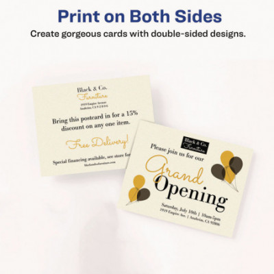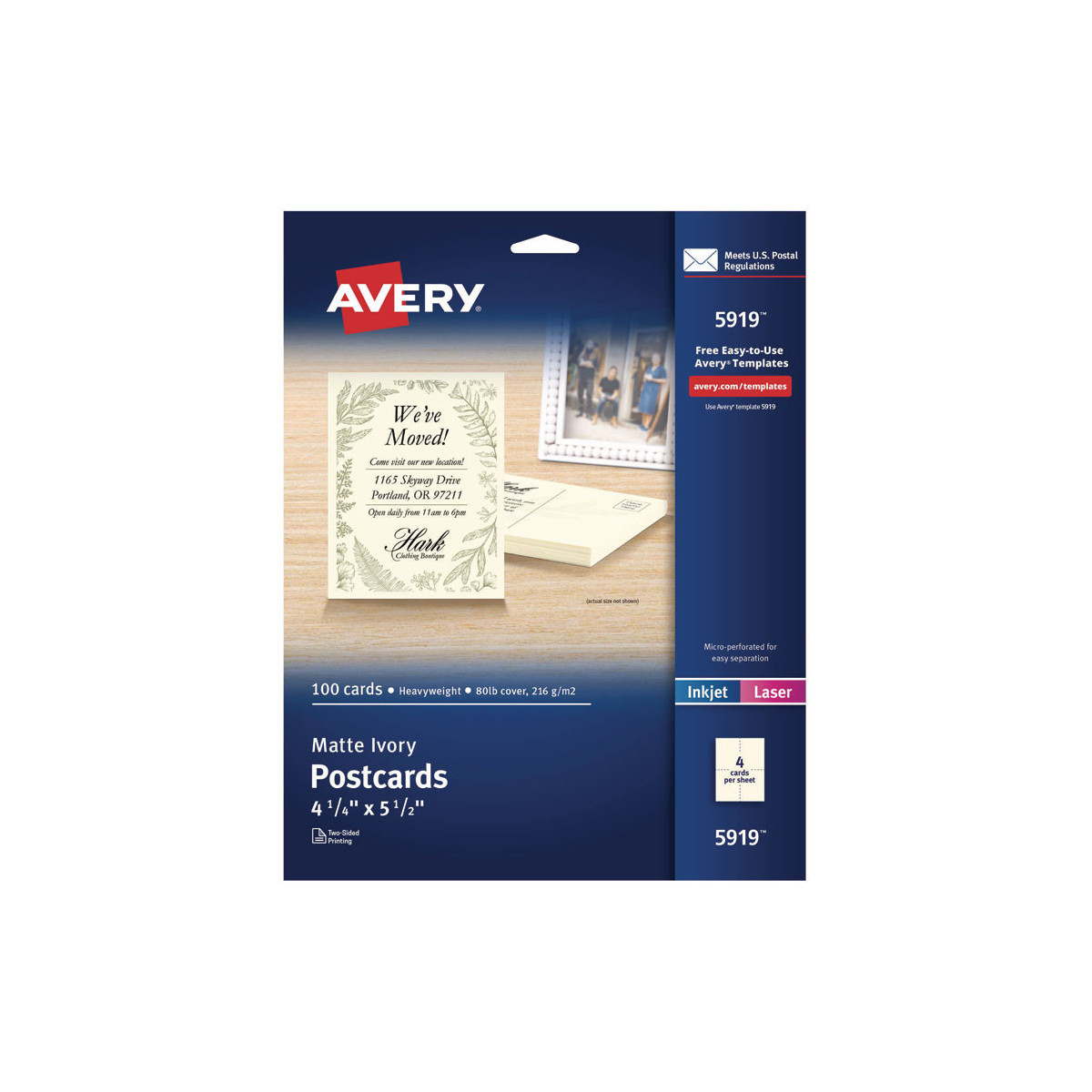 Create professional-looking invitations, announcements, reminders, seasonal offers and more. Sturdy bright white cardstock is either matte-coated for vivid graphics and sharp text or has a premium quality glossy finish ideal for photos. Ultra-fine perforations let you separate cards cleanly and easily. Meets U.S. postal regulations for postcards. Easy to customize with free templates and designs using Avery Design & Print Online. 8.5" x 11" sheets.