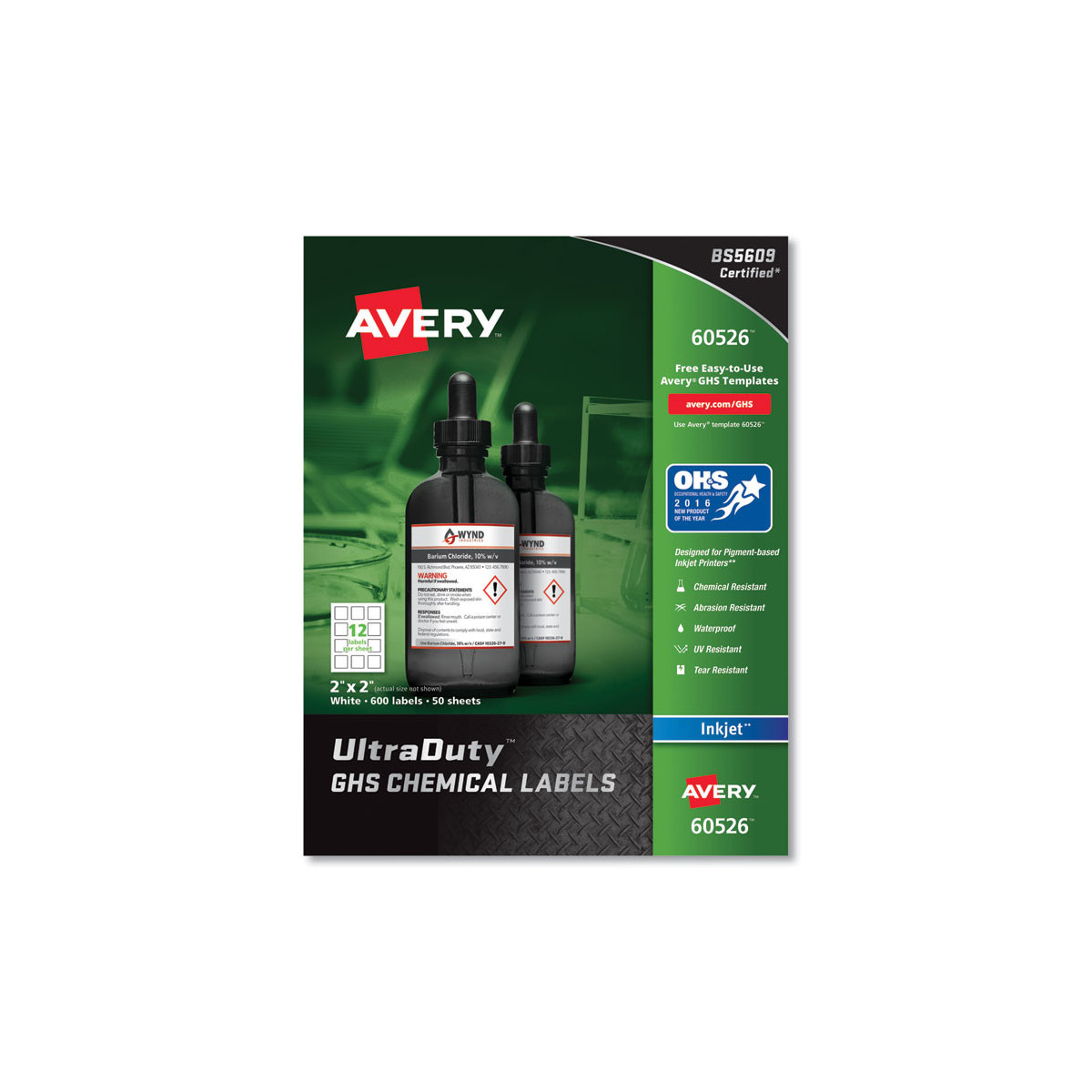 UltraDuty GHS Chemical Waterproof and UV Resistant Labels, 2 x 2, White, 12/Sheet, 50 Sheets/Pack