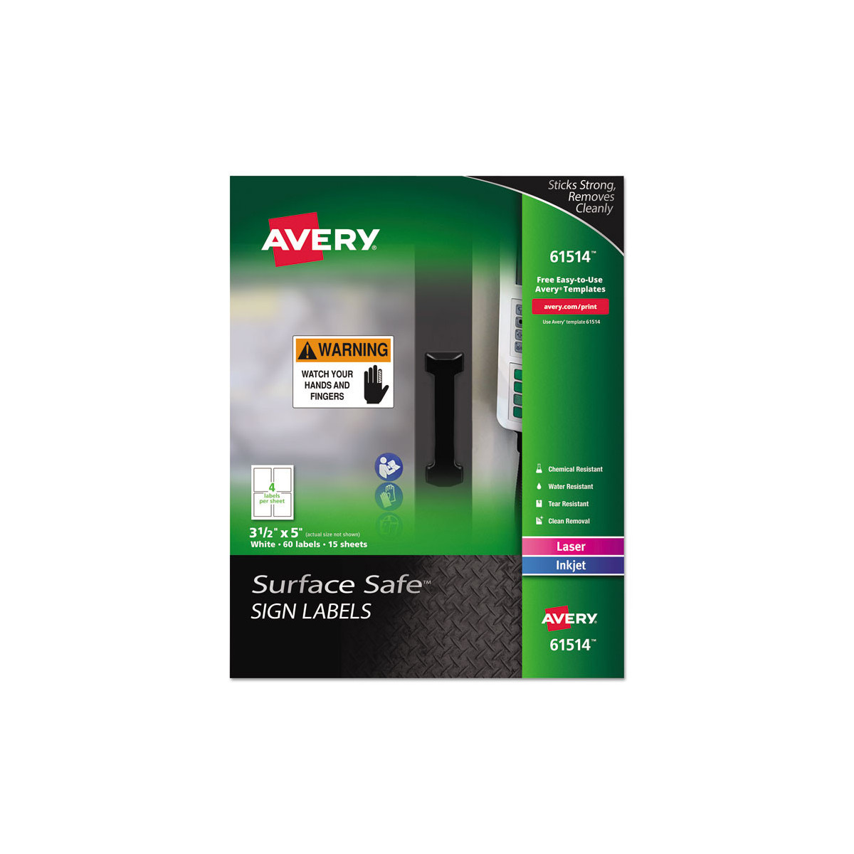 Easily create cost-effective removable label signs that will help maintain a safe workplace without damaging walls and paint. Made of durable, professional-grade material, and engineered to resist water, chemicals and hold up to wear and tear in warehouses and on the manufacturing floor. Specially designed Surface Safe® adhesive sticks securely yet removes cleanly from painted walls, drywall, metal and glass without any residue or damage to surfaces. For laser and inkjet printers - no special label or sign printer required. Customize and print using Avery® Design and Print software. Choose from hundreds of stock designs that are compliant with ANSI® and OSHA®, or customize your own.