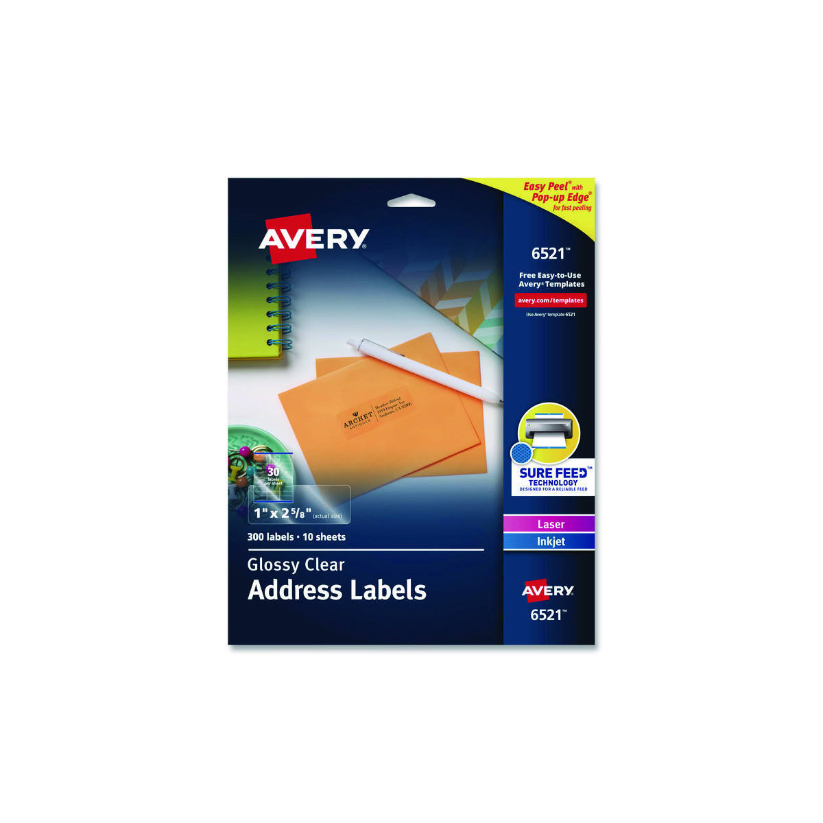 High-gloss clear labels provide a premium, custom-printed look. Ideal for bright colored surfaces. Labels with Sure Feed® technology are designed for a reliable feed through your printer. Easy Peel® label sheets bend to expose Pop-Up Edge® for fast peeling. Easy to customize with free templates and designs at Avery Design & Print. Permanent labels are guaranteed to stick and stay. 8 1/2" x 11" sheets for laser and inkjet printers.