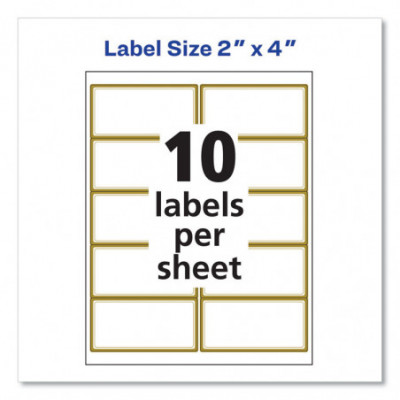 Remarkably reflective and elegant, Avery matte white rectangle labels with metallic gold borders bring a strikingly radiant shine to any event or project. Each rectangle label is pre-printed with a brilliant gold foil-like border that is guaranteed to capture people's attention. Avery Easy Peel technology makes it simple and easy to peel and place multiple labels quickly. Just bend back the label sheet to expose the pop up edges to peel away each label without risking ripping or tearing. Using a strong permanent adhesive, every label can stick and stay to a variety of surfaces including cardboard, envelopes, paper, glass, metal and more. Create beautiful designs and make your own address labels, wedding RSVP labels, party favor labels, product labels, food labels, holiday cards and more using the free design software and templates at avery.com/templates. Compatible with both laser and inkjet printers.
