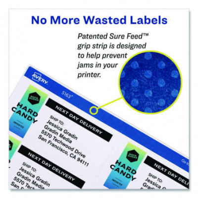 Instantly make changes, revisions or updates. Sure Feed® technology ensures reliable printer feed through. Permanent adhesive sticks and stays! Ideal for permanent identification, small mailings, filing and more. Easy to customize with free templates from Avery® Design & Print.