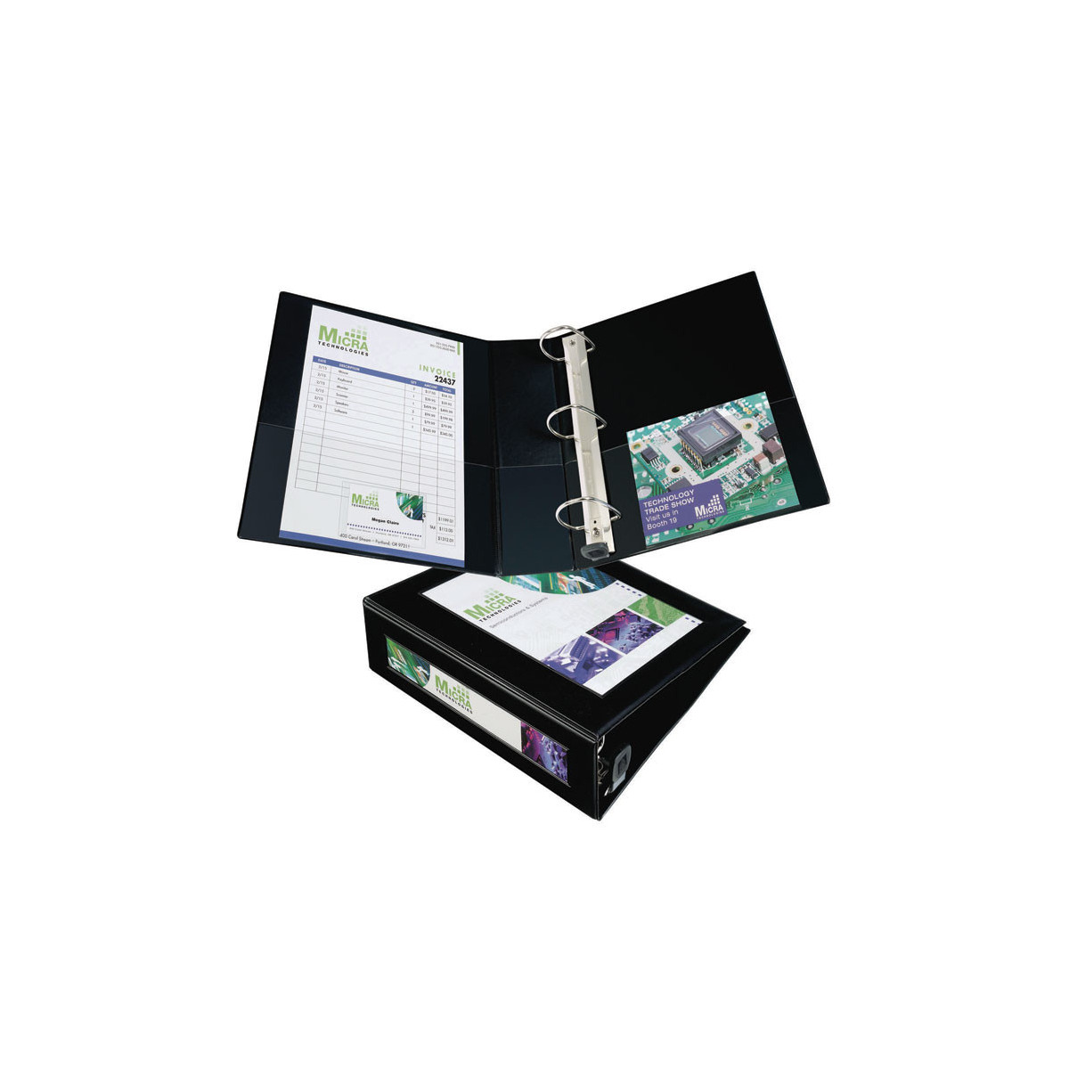 Border on front panel frames and centers title page for a professional look. Easily customize cover and spine using free designs and templates from Avery® Design & Print. Easily insert title page and spine ID with convenient mounting sheets. Two clear interior pockets and a business card pocket add to the professional image. Wider front and back panels fully cover standard dividers and sheet protectors. Pages lie flat with back-mounted rings (exposed rivets on back).