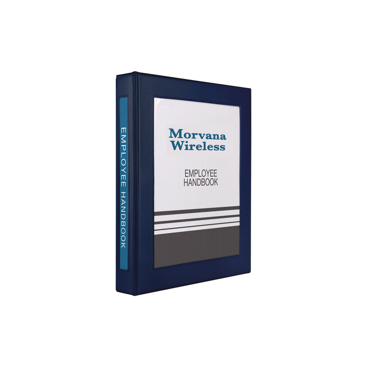 Border on front panel frames and centers title page for a professional look. Easily customize cover and spine using free designs and templates from Avery® Design & Print. Easily insert title page and spine ID with convenient mounting sheets. Two clear interior pockets and a business card pocket add to the professional image. Wider front and back panels fully cover standard dividers and sheet protectors. Pages lie flat with back-mounted rings (exposed rivets on back).