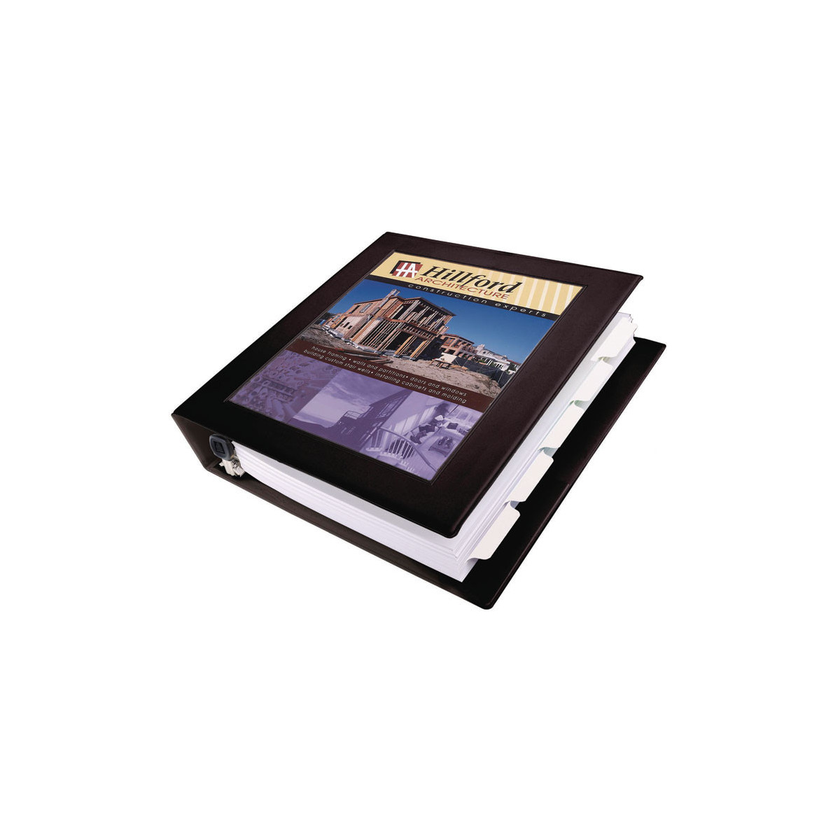 Border on front panel frames and centers title page for a professional look. Easily customize cover and spine using free designs and templates from Avery® Design & Print. Easily insert title page and spine ID with convenient mounting sheets. Two clear interior pockets and a business card pocket add to the professional image. Wider front and back panels fully cover standard dividers and sheet protectors. Pages lie flat with back-mounted rings (exposed rivets on back).