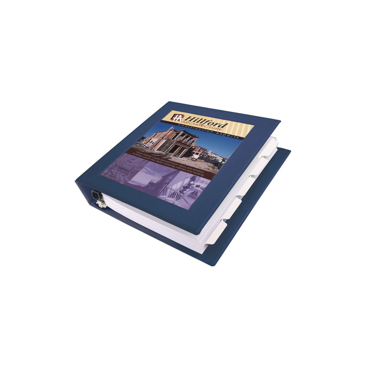 Border on front panel frames and centers title page for a professional look. Easily customize cover and spine using free designs and templates from Avery® Design & Print. Easily insert title page and spine ID with convenient mounting sheets. Two clear interior pockets and a business card pocket add to the professional image. Wider front and back panels fully cover standard dividers and sheet protectors. Pages lie flat with back-mounted rings (exposed rivets on back).