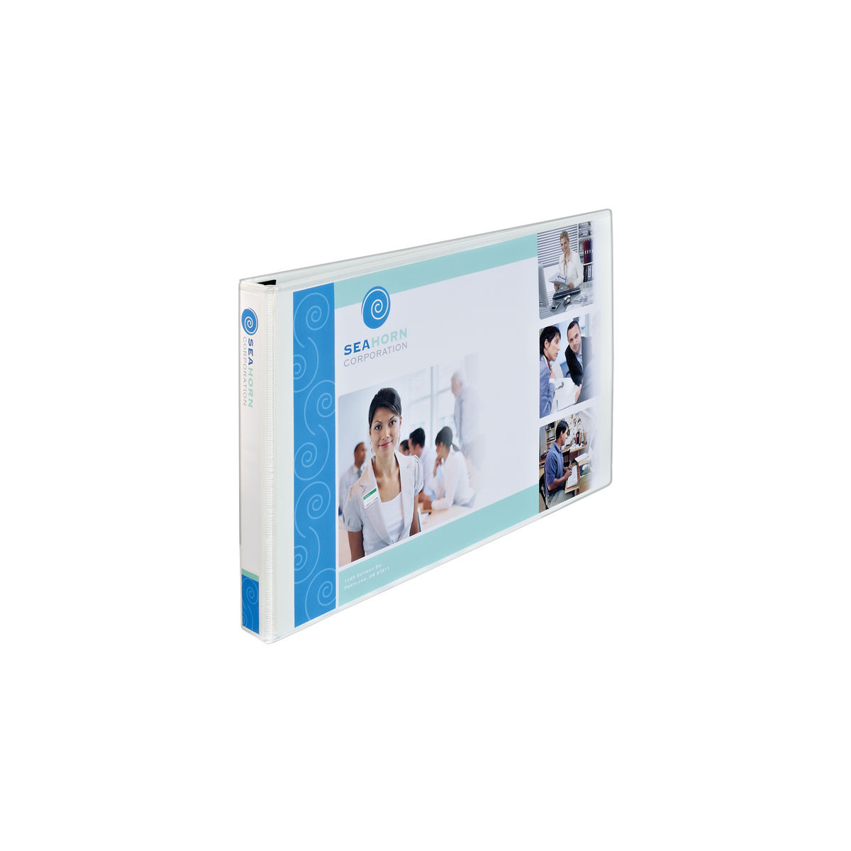 11 x 17 durable view binder for engineering documents, blueprints, projects and more. Clear cover and spine for easy customization. Two clear pockets provide extra storage. Pages lie flat with back mounted rings (exposed rivets on back).