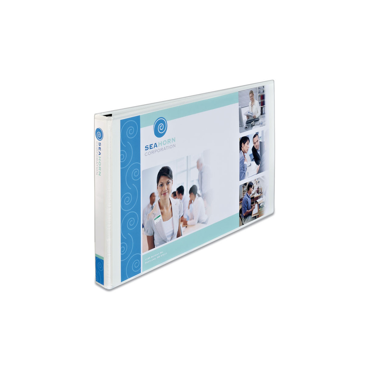 11 x 17 durable view binder for engineering documents, blueprints, projects and more. Clear cover and spine for easy customization. Two clear pockets provide extra storage. Pages lie flat with back mounted rings (exposed rivets on back).