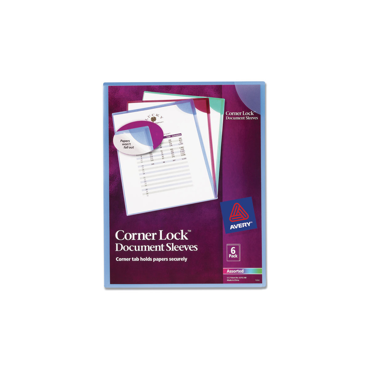 Hold and secure important documents with Avery Corner Lock Document Sleeves. Each plastic sleeve can easily store a variety of documents including letter-sized paper, photos, tickets, brochures, and receipts. These plastic sleeves feature two sealed sides that provide easy page access and protection and two corner document tabs designed to hold and secure your sheets. Keep your pages in pristine condition as the sturdy plastic material helps protect against damp surfaces, dirt, markings, scratches, and crumpling. This non-stick poly material is also designed to not lift print from your sheets. Use the sleeve as a travel document organizer as the thin, lightweight design allows for easy portability. Unique colored translucent back sleeves designed for easy, color-coding organization. Each sleeve features a clear front cover that allows you to add a title page. Whether your documents are for school, home, or work, use the predesigned binder templates and designs at avery.com to create your own cover page. Each plastic document sleeve can hold up 20 sheets of 8.5" x 11" paper.