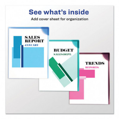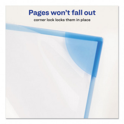 Corner Lock® feature ensures papers won't fall out. Translucent colored back cover with clear front cover for color coding and easy identification of contents. Sealed on two sides for easy access. Durable, yet lightweight and portable. Non-stick, polypropylene material won't lift print. Sleeves hold up to 20 sheets of 8.5" x 11" paper.