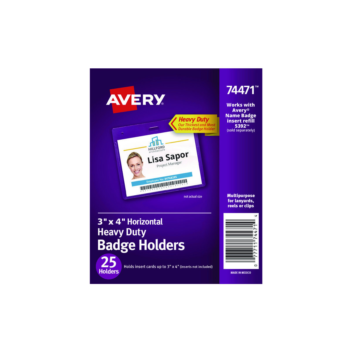 Secure design keeps badges from falling out. Heavyweight flexible plastic is ideal for permanent or temporary identification. Protect security access control cards or create name badges. Multi-use styles are pre-punched to accommodate lanyards and reel clips. Use with Avery® Name Badge Inserts (5390 and 5392). Easy to Customize with free templates and designs using Avery Design & Print online.