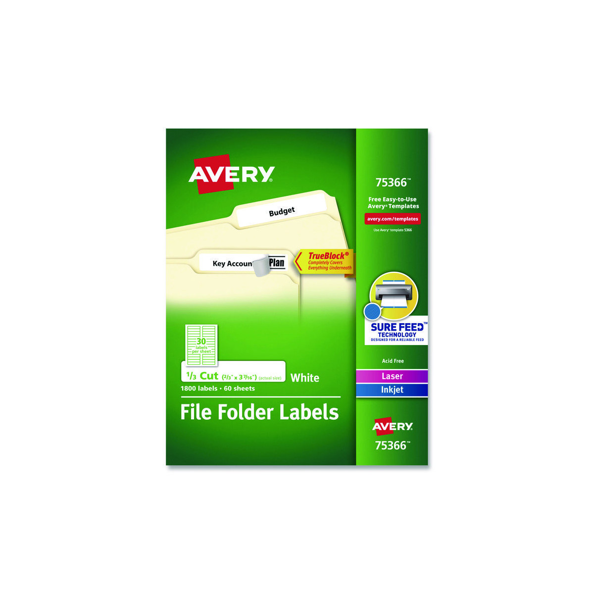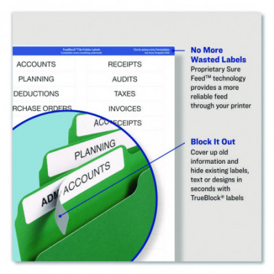 TrueBlock® Technology completely covers up what's underneath so you can create new folders or cover up handwriting or an existing label. Reuse file folders and still obtain a professional appearance. Labels with Sure Feed® technology are designed for a reliable feed through your printer. Easy to customize with free templates from Avery® Design & Print. 8 1/2" x 11" sheets for laser and inkjet printers.