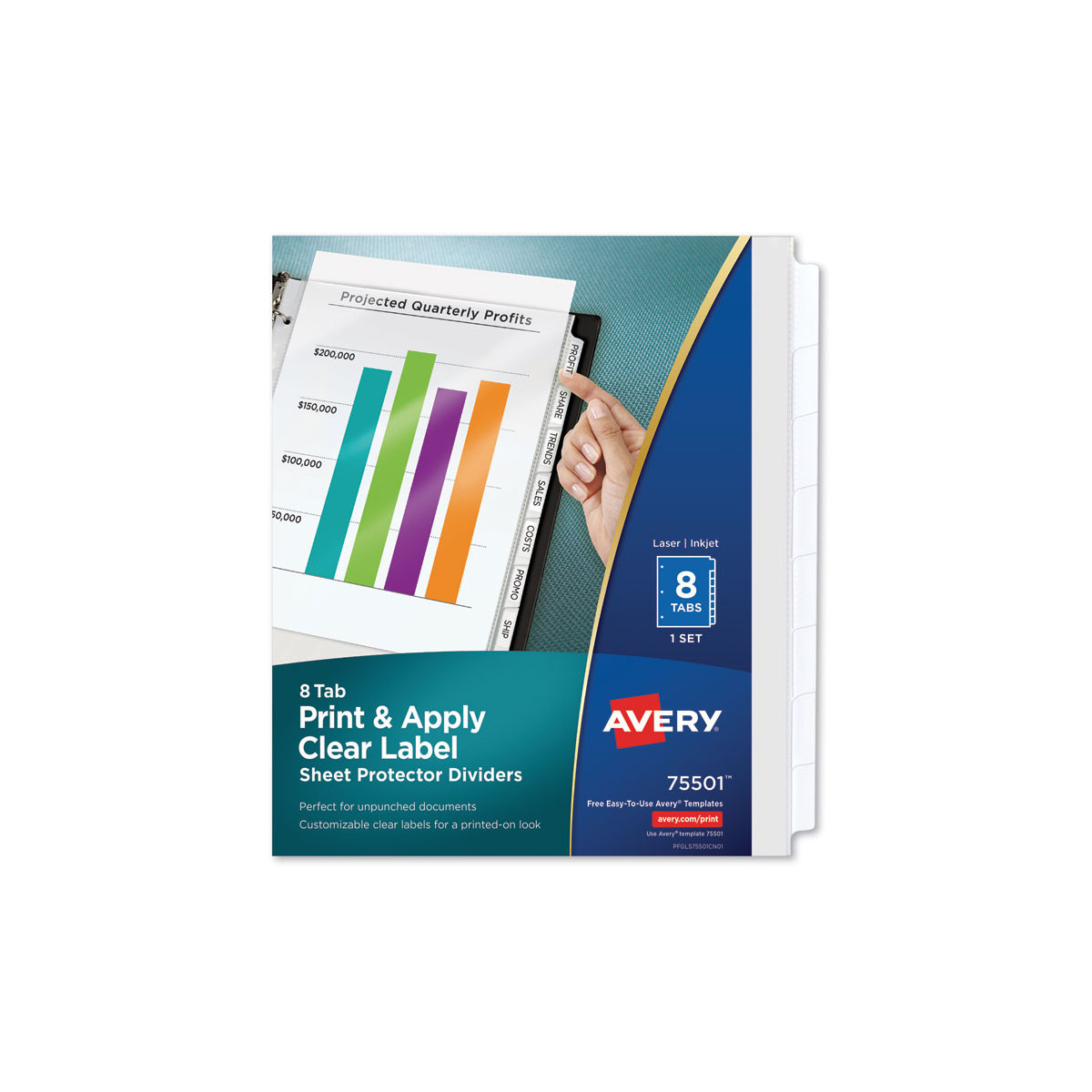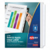 Index Maker® Dividers make organization easier. Whether you're coordinating a single project or multiple binder sets, these dividers let you get it done quickly and easily, with professional results. Pockets provide room for colorful section title pages or handouts. The clear labels virtually disappear on the tabs, giving your dividers a clean, printed-on look. Save time with the Easy Apply™ strip that lets you label all the tabs at once, making it simple to create custom dividers right from your desktop. Easy to customize with free templates at Avery Design & Print—personalize your Easy Apply™ tab labels in minutes. These dividers are a great solution for all of your organizing needs. For laser and inkjet printers.