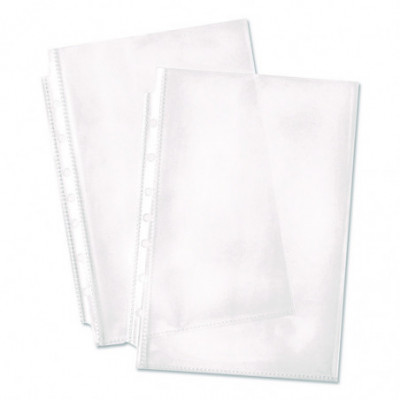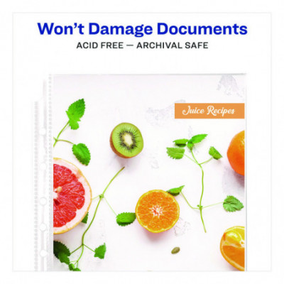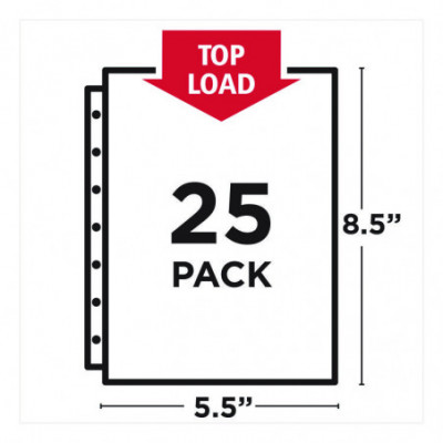 Thick and durable with a diamond clear finish. Ideal for long-term storage, non-stick polypropylene material is acid-free and won't lift print. Top loading—seven-hole punched. Clear binding edge for a professional look. Protects 5 1/2" x 8 1/2" inserts.