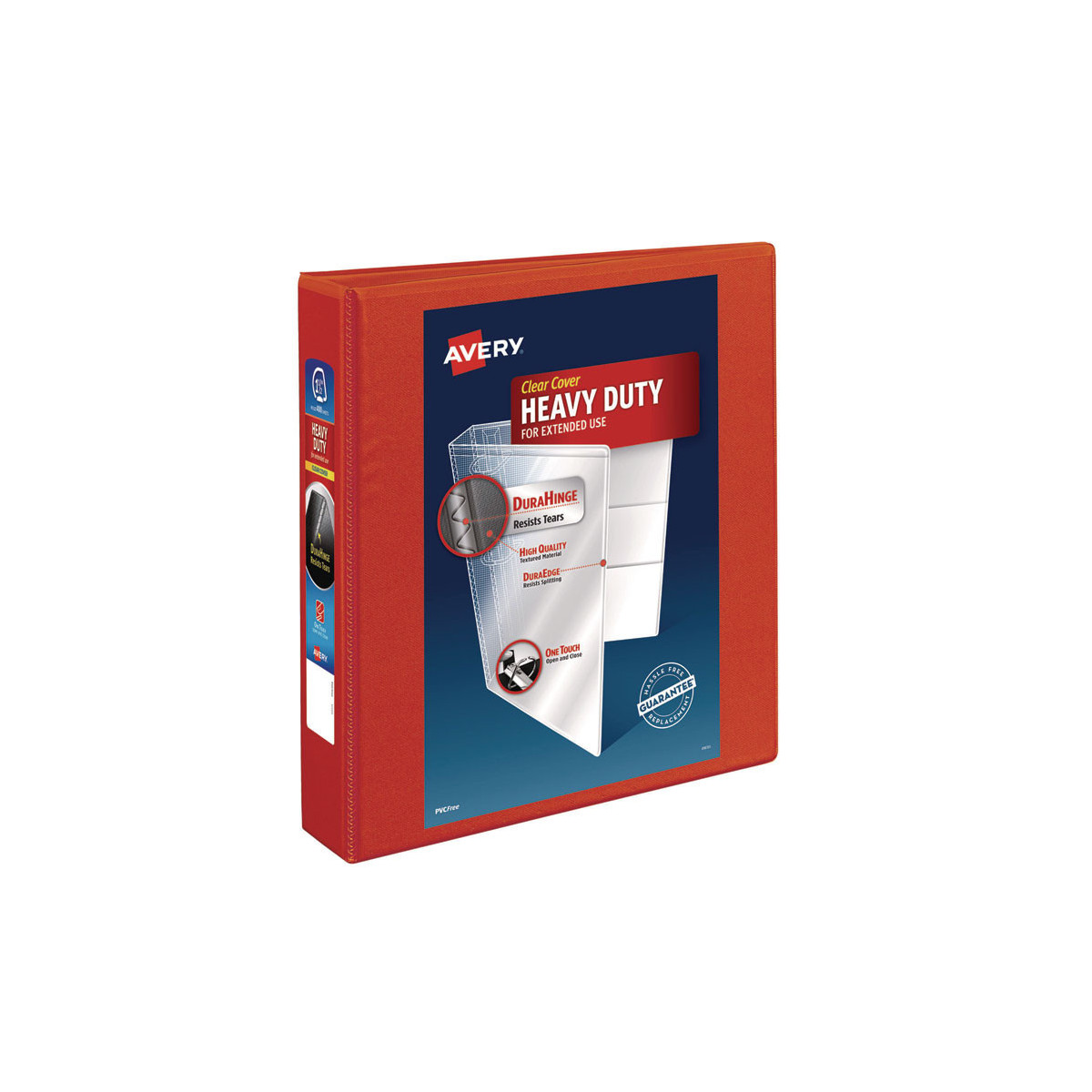Heavy-Duty view binder with one touch EZD rings is perfect for long-term, regular use. Tear-resistant DuraHinge design is stronger and lasts longer. DuraEdge feature makes the sides and top more pliable, providing greater split resistance. Deep-textured film offers a smoother finish and features a linen pattern for a high-quality look and feel. Clear cover and spine for easy customization. Four clear, interior pockets provide extra storage space. Wider front and back panels fully cover standard dividers and sheet protectors. One touch EZD rings provide easy access and have a higher page capacity when compared to the same size round rings. Customize the cover with free, easy-to-use templates and designs at Avery Design & Print online.