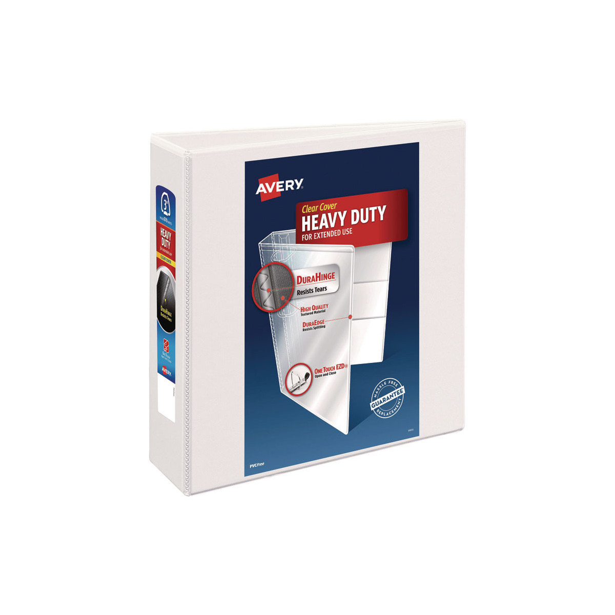 Heavy-Duty view binder with one touch EZD rings is perfect for long-term, regular use. Tear-resistant DuraHinge design is stronger and lasts longer. DuraEdge feature makes the sides and top more pliable, providing greater split resistance. Deep-textured film offers a smoother finish and features a linen pattern for a high-quality look and feel. Clear cover and spine for easy customization. Four clear, interior pockets provide extra storage space. Wider front and back panels fully cover standard dividers and sheet protectors. One touch EZD rings provide easy access and have a higher page capacity when compared to the same size round rings. Customize the cover with free, easy-to-use templates and designs at Avery Design & Print online.