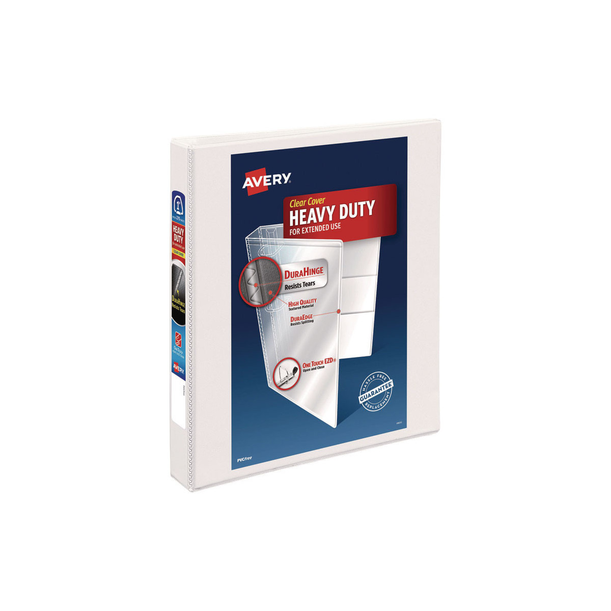 Heavy-Duty view binder with one touch EZD rings is perfect for long-term, regular use. Tear-resistant DuraHinge design is stronger and lasts longer. DuraEdge feature makes the sides and top more pliable, providing greater split resistance. Deep-textured film offers a smoother finish and features a linen pattern for a high-quality look and feel. Clear cover and spine for easy customization. Four clear, interior pockets provide extra storage space. Wider front and back panels fully cover standard dividers and sheet protectors. One touch EZD rings provide easy access and have a higher page capacity when compared to the same size round rings. Customize the cover with free, easy-to-use templates and designs at Avery Design & Print online.