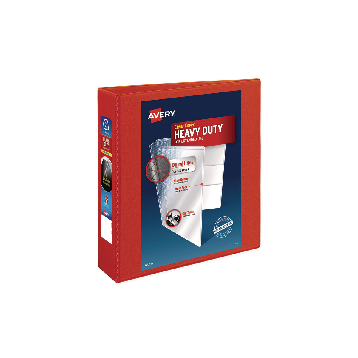 Heavy-Duty view binder with one touch EZD rings is perfect for long-term, regular use. Tear-resistant DuraHinge design is stronger and lasts longer. DuraEdge feature makes the sides and top more pliable, providing greater split resistance. Deep-textured film offers a smoother finish and features a linen pattern for a high-quality look and feel. Clear cover and spine for easy customization. Four clear, interior pockets provide extra storage space. Wider front and back panels fully cover standard dividers and sheet protectors. One touch EZD rings provide easy access and have a higher page capacity when compared to the same size round rings. Customize the cover with free, easy-to-use templates and designs at Avery Design & Print online.
