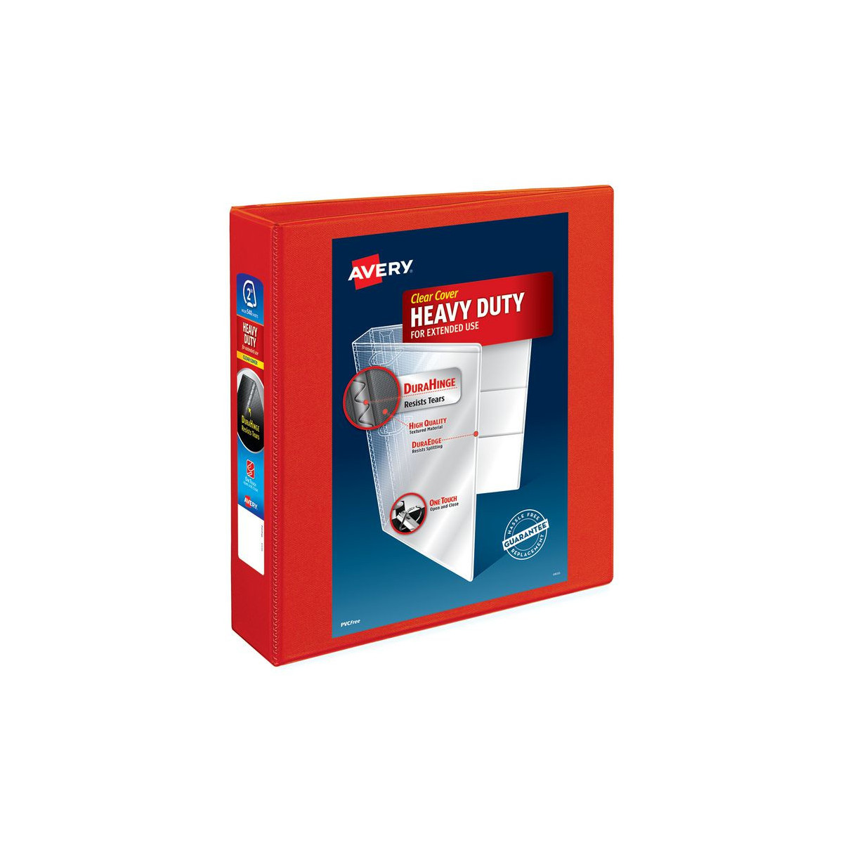 Heavy-Duty view binder with one touch EZD rings is perfect for long-term, regular use. Tear-resistant DuraHinge design is stronger and lasts longer. DuraEdge feature makes the sides and top more pliable, providing greater split resistance. Deep-textured film offers a smoother finish and features a linen pattern for a high-quality look and feel. Clear cover and spine for easy customization. Four clear, interior pockets provide extra storage space. Wider front and back panels fully cover standard dividers and sheet protectors. One touch EZD rings provide easy access and have a higher page capacity when compared to the same size round rings. Customize the cover with free, easy-to-use templates and designs at Avery Design & Print online.