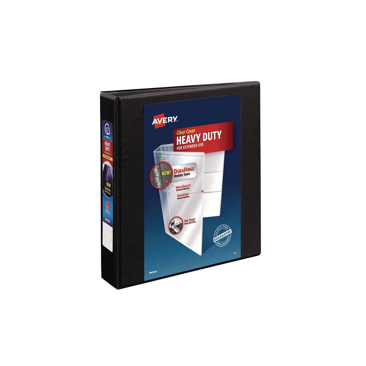 Heavy-Duty view binder with one touch EZD rings is perfect for long-term, regular use. Tear-resistant DuraHinge design is stronger and lasts longer. DuraEdge feature makes the sides and top more pliable, providing greater split resistance. Deep-textured film offers a smoother finish and features a linen pattern for a high-quality look and feel. Clear cover and spine for easy customization. Four clear, interior pockets provide extra storage space. Wider front and back panels fully cover standard dividers and sheet protectors. One touch EZD rings provide easy access and have a higher page capacity when compared to the same size round rings. Customize the cover with free, easy-to-use templates and designs at Avery Design & Print online.