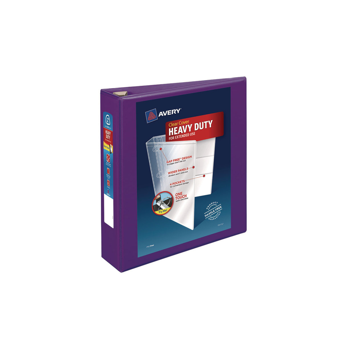 Heavy-Duty view binder with one touch EZD rings is perfect for long-term, regular use. Tear-resistant DuraHinge design is stronger and lasts longer. DuraEdge feature makes the sides and top more pliable, providing greater split resistance. Deep-textured film offers a smoother finish and features a linen pattern for a high-quality look and feel. Clear cover and spine for easy customization. Four clear, interior pockets provide extra storage space. Wider front and back panels fully cover standard dividers and sheet protectors. One touch EZD rings provide easy access and have a higher page capacity when compared to the same size round rings. Customize the cover with free, easy-to-use templates and designs at Avery Design & Print online.