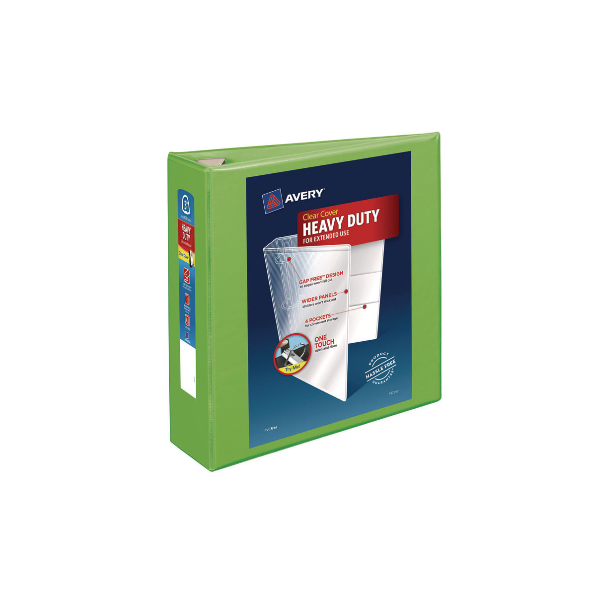 Heavy-Duty view binder with one touch EZD rings is perfect for long-term, regular use. Tear-resistant DuraHinge design is stronger and lasts longer. DuraEdge feature makes the sides and top more pliable, providing greater split resistance. Deep-textured film offers a smoother finish and features a linen pattern for a high-quality look and feel. Clear cover and spine for easy customization. Four clear, interior pockets provide extra storage space. Wider front and back panels fully cover standard dividers and sheet protectors. One touch EZD rings provide easy access and have a higher page capacity when compared to the same size round rings. Customize the cover with free, easy-to-use templates and designs at Avery Design & Print online.