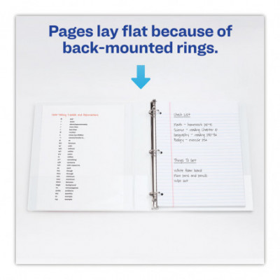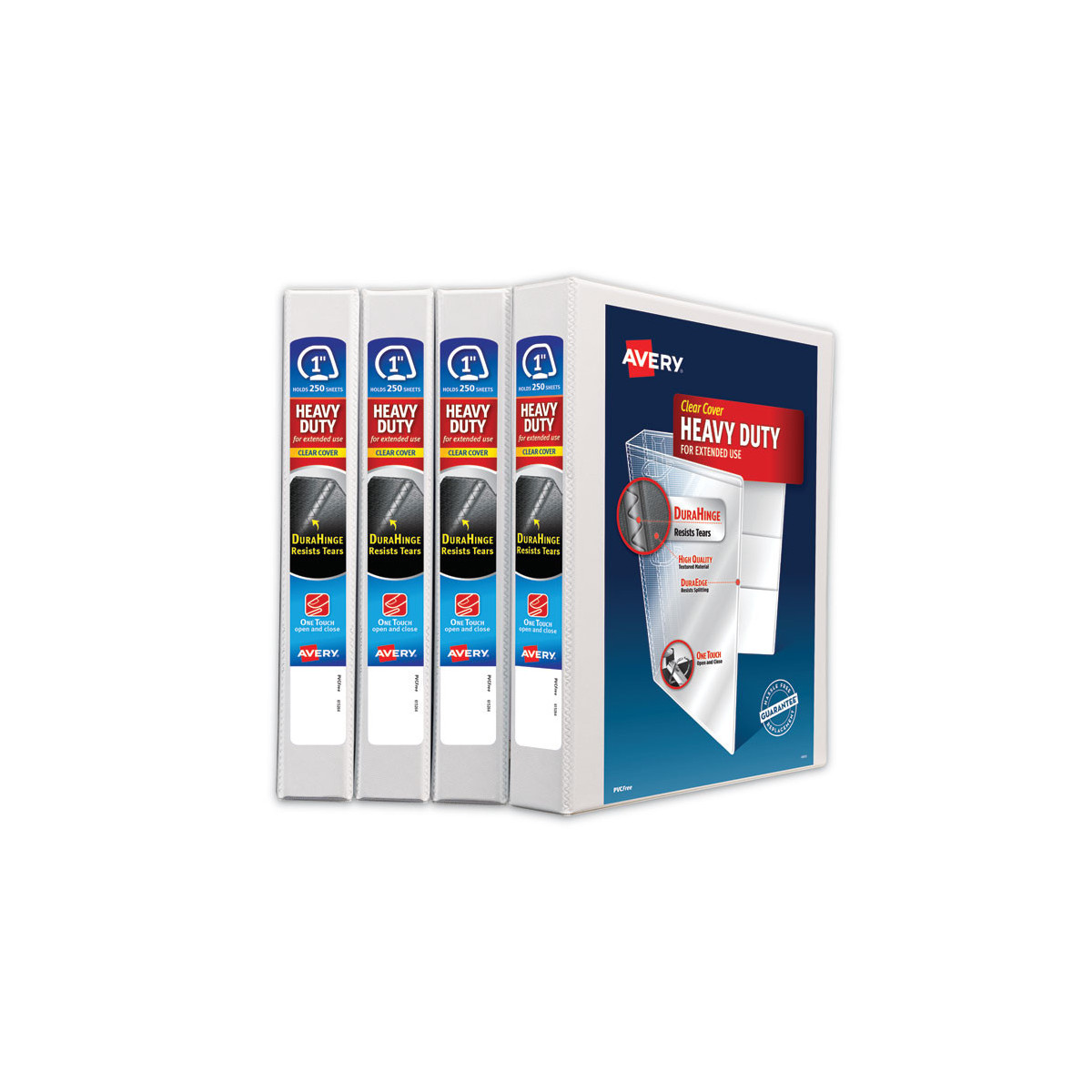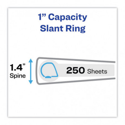 With this Heavy-Duty Nonstick View Binder you get one-touch operation and the durability required for everyday use. Nonstick material won't lift ink or toner off printed pages. Tear-resistant DuraHinge® design is stronger and lasts longer. DuraEdge® feature makes the sides and top more pliable, providing greater split resistance. Deeply textured film offers a smoother finish and features a linen pattern for a high-quality look and feel. Four clear, interior pockets provide extra storage space. Wider front and back panels fully cover standard dividers and sheet protectors. Slant rings have a higher page capacity when compared to the same size round rings. Pages lie flat with back-mounted rings (exposed rivets on back). Customize your title page using free templates and designs at Avery® Design & Print Online.