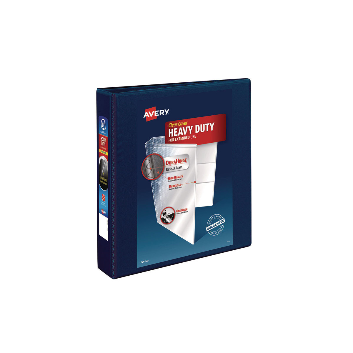Heavy-Duty view binder with one touch EZD rings is perfect for long-term, regular use. Tear-resistant DuraHinge design is stronger and lasts longer. DuraEdge feature makes the sides and top more pliable, providing greater split resistance. Deep-textured film offers a smoother finish and features a linen pattern for a high-quality look and feel. Clear cover and spine for easy customization. Four clear, interior pockets provide extra storage space. Wider front and back panels fully cover standard dividers and sheet protectors. One touch EZD rings provide easy access and have a higher page capacity when compared to the same size round rings. Customize the cover with free, easy-to-use templates and designs at Avery Design & Print online.
