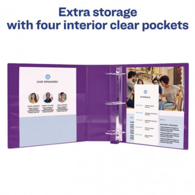 Heavy-Duty view binder with one touch EZD rings is perfect for long-term, regular use. Tear-resistant DuraHinge design is stronger and lasts longer. DuraEdge feature makes the sides and top more pliable, providing greater split resistance. Deep-textured film offers a smoother finish and features a linen pattern for a high-quality look and feel. Clear cover and spine for easy customization. Four clear, interior pockets provide extra storage space. Wider front and back panels fully cover standard dividers and sheet protectors. One touch EZD rings provide easy access and have a higher page capacity when compared to the same size round rings. Customize the cover with free, easy-to-use templates and designs at Avery Design & Print online.