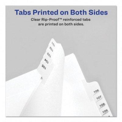 Use these dividers to organize index briefs, legal exhibits, mortgage documentation files and more. The crisp and clean white paper stock dividers give files a professional appearance. The durable Rip Proof™ reinforced tabs are preprinted on both sides so information can be located easily. The unpunched binding edges mean these indexes can fit practically any binding system.